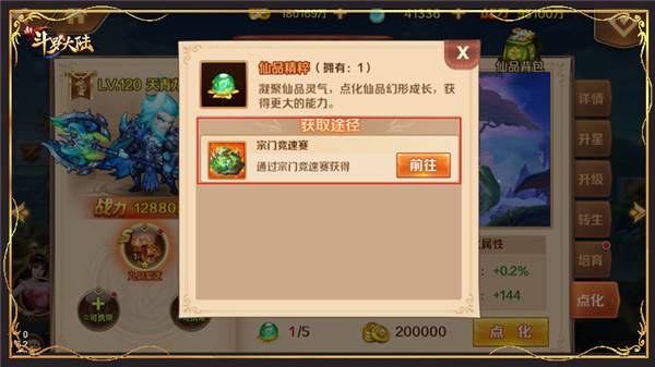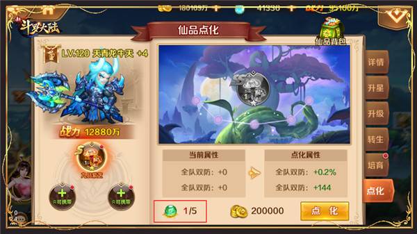 1、仙品最重要的就是点化,SS 仙品点化分为5等级,持续点化可以获得更高能力。点化提升主要围绕全队攻防血数值及百分比,稀有属性在套装获得。