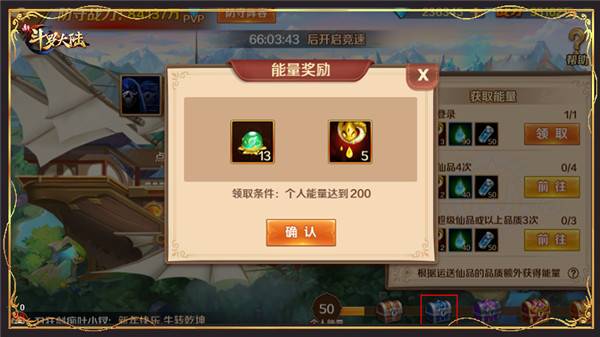 6、在能量宝箱中宗门竞速个人能力达到200、400的时候分别可以获得13、15个仙品精粹。