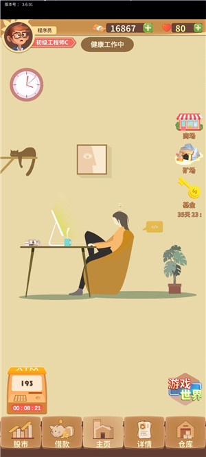 在现实世界里,获取钞票的途径主要是你的工资,还有形形色色的券以及箱子。要是想快速拿到钞票该怎么做呢?你能够点击左上角人物的职级,就像上图中的初级工程师C。加班能够加快升职的进程,不过要注意,大学生的工资会随着职级的提升而降低,务必谨慎。加班会损耗健康,具体来说,如果你的健康值在80级以上,工作效率就是100%;健康值低于80时,工作效率便会下降;当健康值降到20时,工作效率为0,也就永远拿不到工资了。所以无论何时,除非马上要嗑药,都要确保健康值在80。点击游戏右上方的健康值加号就能进入药店,当健康值低于80时,界面右侧会出现救护车,乘坐它同样能进入药店。