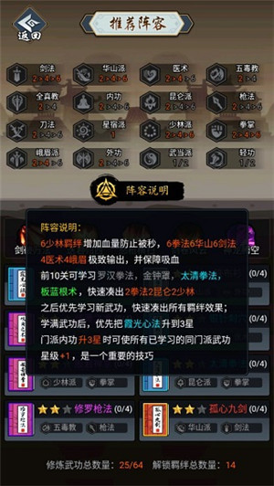 每种武功都具备门派与职业属性,集齐特定数量同门派或同职业的武功,就能激活对应的羁绊效果,使战力得到显著提升。务必重视武功阵容的搭配,从而激活强大的羁绊组合。