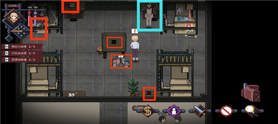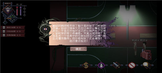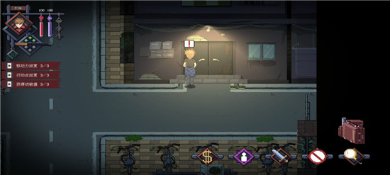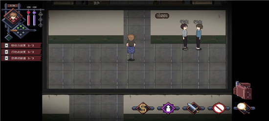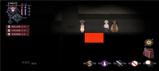 右下角的图标,第一个是交易图标,用于队内物资协调,每个角色在自己的行动轮中可使用一次。第二个图标与左上角的三个小标识联动,涉及相关判定,但序章中不会用到。第三个图标是战斗键,用于发起战斗,虽然使用频率较高,但每次使用会消耗三点行动点,这点需要留意。