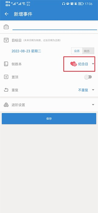 2、在添加时间中的倒数本中选择纪念日,并将日期等设置完成后,点击保存