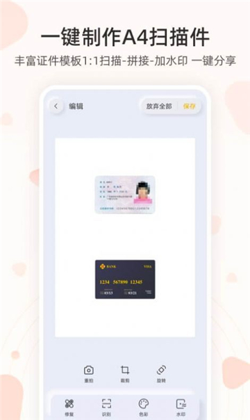 1、证件扫描自动排版,并支持添加防盗水印,更轻便、更安全。