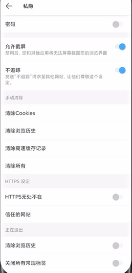 隐私配置选项涵盖浏览器密码设置、截屏权限设定、浏览器记录自动清空以及强制HTTPS等安全相关内容,这些对于保护浏览器中的个人隐私极为关键。