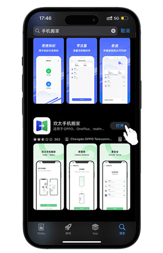 2、在旧手机上打开APP Store,在搜索栏输入‘欢太手机搬家’(需注意,其他搬家软件可能存在风险,务必认准此软件名称),然后点击安装。
