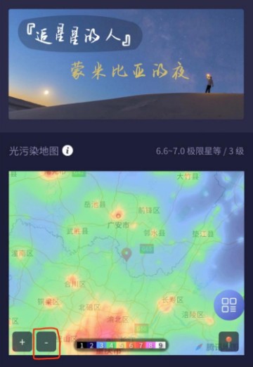 接着滑动至最底部,查看目的地的光污染状况(光污染等级至少四级,越低越佳),点击缩小按钮三次,观察目的地周边的光污染情形,特别是南边的光污染(夏季时,银河的银心位置很接近南边)。