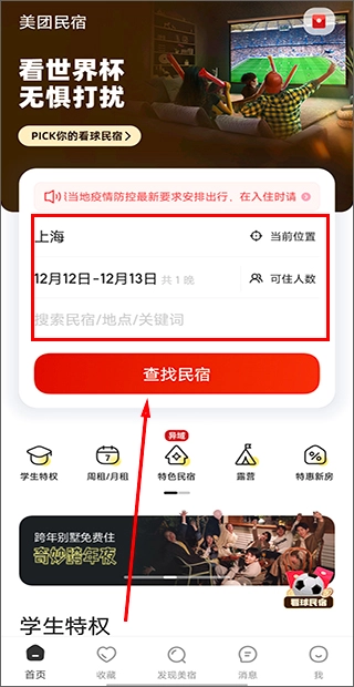 1、进入软件后,在首页选择当前所在位置和需要入住的人数、天数,点击“查找民宿”即可;
