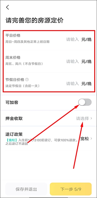 7、介绍完成自己的房源后,我们就可以给房源进行定价了,此时您还可以设置押金、是否可以加客和退订政策等等;