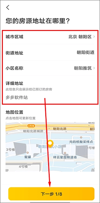 3、若要自助发布房源,需先选定房源的详细地址,填写城市区域、街道地址、小区名称及详细地址等相关信息,然后点击下一步。