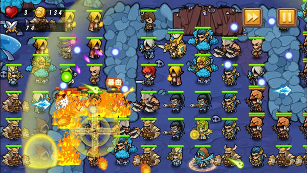 游戏的战斗画面会显示战斗场景、角色模型、血量状态、战斗动画、各种特效等。同时还包括剩余血量、总金币、敌方波数的显示,并拥有加速播放和暂停功能。