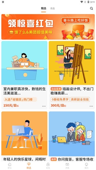 2、进入到精选,在这里有很多无需出门就可以工作的兼职,闲暇时期也可以赚钱;