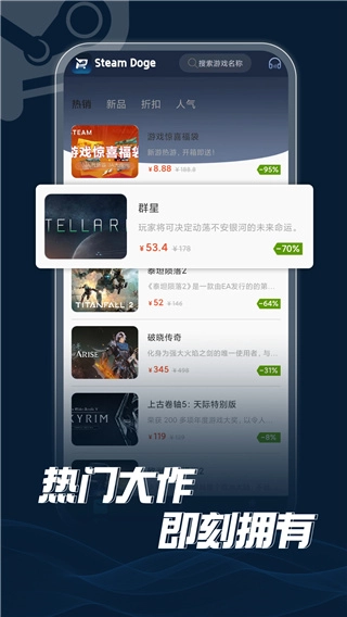 想知道最新的Steam游戏折扣吗?不妨来试试这款SteamDoge商城。它是官方正版授权的Steam商城,也是专为Steam游戏爱好者打造的折扣平台,可用于购买游戏或游戏道具,还能实时获取最新游戏折扣信息。无论是最新推出的新游、近期热门游戏,还是相对冷门的游戏,SteamDoge商城都有收录,只需在搜索框精准搜索就能定位。而且,用户在SteamDoge商城无需登录Steam账号,直接通过手机号验证码登录即可,避免了登录Steam账号的繁琐步骤。可能有些小伙伴会疑惑,不登录Steam账号怎么购买到账号里呢?其实,购买成功后,系统会自动跳转到购买成功页面,在该页面复制激活码信息,然后在Steam客户端进行兑换就行。