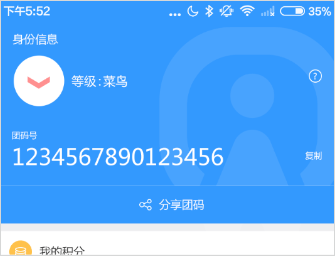 账号登录后进入"我的~页面,使用上方的【分享团码】,把你的团码分享出去。