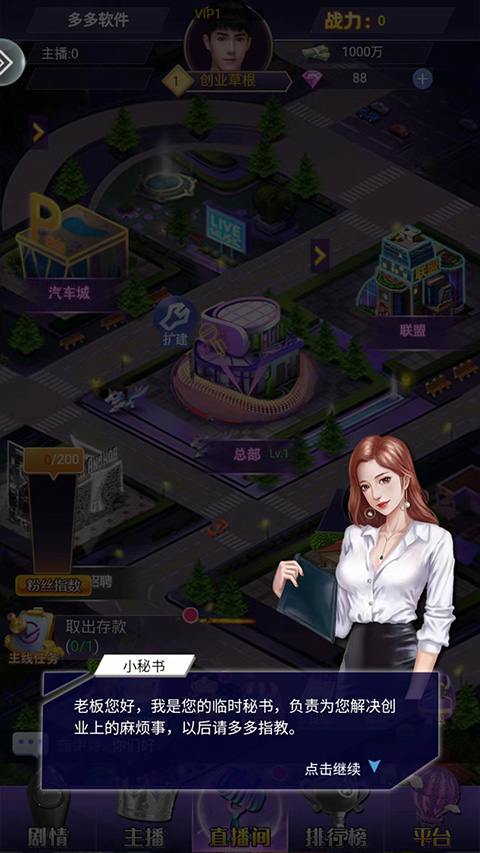 8、玩家需要逐渐建立自己的各种直播间、汽车城、联盟等等,提升身份,打造自己的商业帝国,