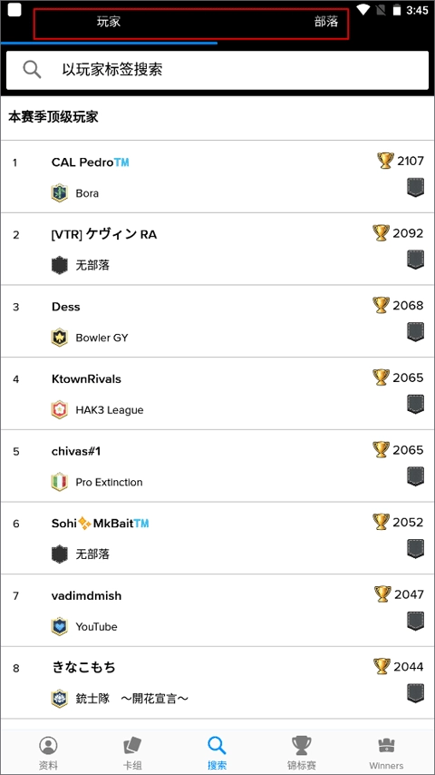 搜索由玩家与部落这两个部分构成,均借助标签来查找对应的成就、等级等相关信息。