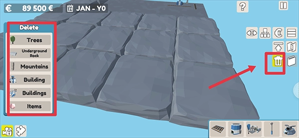 2、每种矿石与液体都被石头覆盖着。若想开启采矿,就需移除石头。若要移除石头或树木,点击垃圾桶按钮,接着在删除选择器里,点击对应的物体就能将其删除。