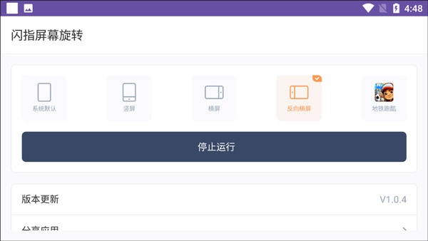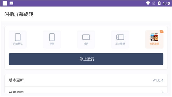 5、要是想关闭横屏,操作也极为简便,回到闪指屏幕旋转软件,点击“停止运行”就能完成关闭操作。