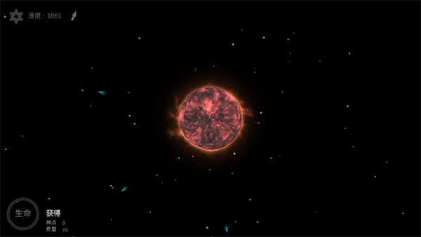 2、首次转化后变为恒星。转化完成后,就无需再费劲地吸附石头了。我到游戏后期才发现一个设定:质量大的恒星能够吸取质量小的恒星的生命。在地图上找到其他恒星后,点击左下角的生命标识,会显示双方的生命值。若你的生命值略高于对方,就可以缓缓靠近,当达到一定距离时,便开始吸取对方生命。等自己的生命值占据较大优势,直接撞上去就能耗死对方。这在游戏中期提升质量的速度特别快,基本上二十多级时,玩上半小时,就能升至好几百级。