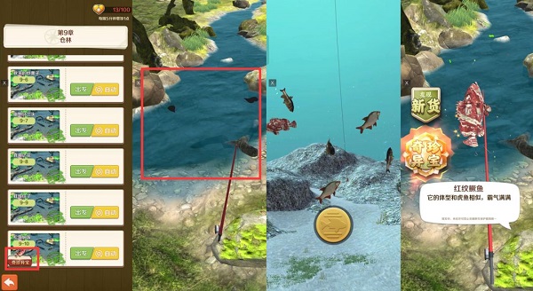 如图2红框标注的位置,点击此处就能尝试钓鱼,不过并非点击一次就能成功钓到,得耐心多尝试几次。红纹鳜鱼生活在水中,位置相对容易确定,然而想要钓到它可没那么简单~