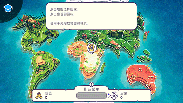 2、进入游戏后,点击地图可以选择国家,使用手势可以缩放地图;