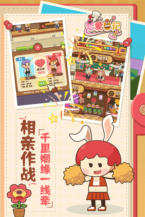《恋爱日记》官方版,是一款画风萌趣的卡通经营类游戏。它以模拟爱情为核心主题,玩家在游戏里将化身为相亲会所的负责人,开启一家专属于自己的店铺,助力年轻人寻觅到合适的伴侣。