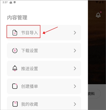 1、开启汽水儿app,进入“我的”界面,点击左上角的设置选项,接着点击“节目导入”。