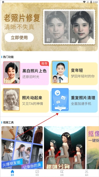 1、打开软件,点击“首页”选项,然后点击“重复照片清理”选项。