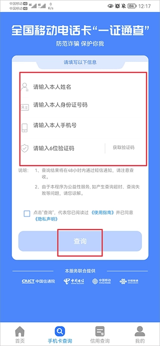 1. 开启一证通查app,于手机卡查询页面里填入姓名、身份证号、手机号以及验证码,然后点击查询。