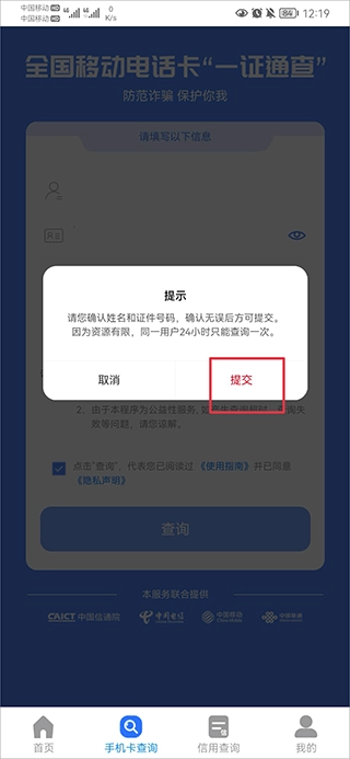 2. 确认姓名与证件号后,点击提交。(特别提醒:鉴于资源有限,同一用户每24小时仅能查询一次。)
