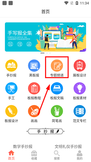 点击首页【专题频道】,即可查看到各种主题的手抄报。