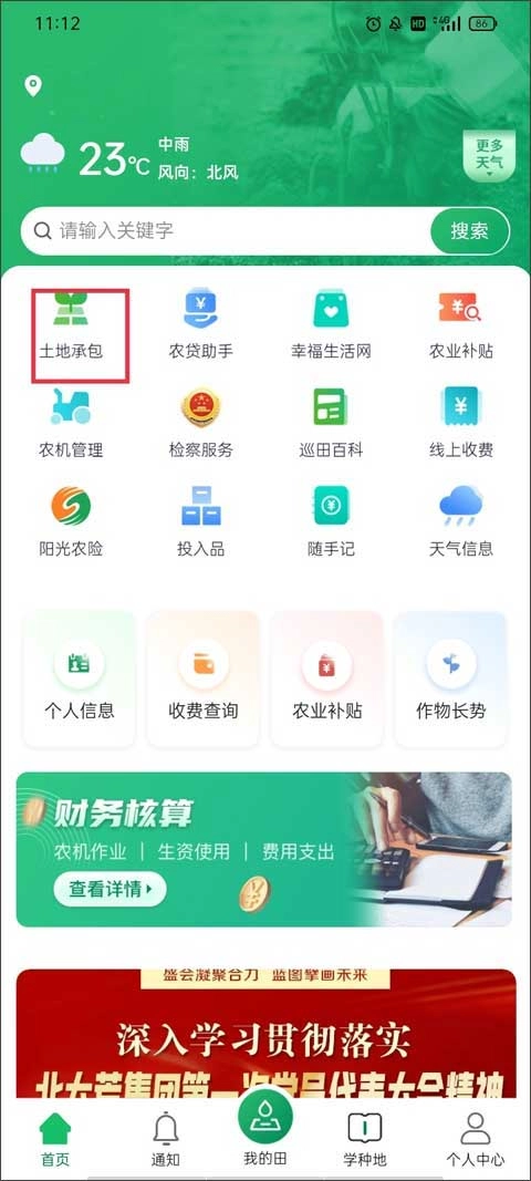 1. 打开app,默认进入【首页】,首页上方有诸多功能选项,点击上方“土地承包”功能。