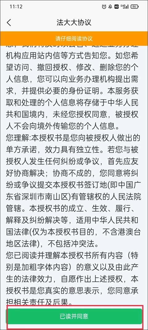 2、认真仔细地阅读法大大的协议,阅读完毕后,点击下方的“已读并同意”按钮。