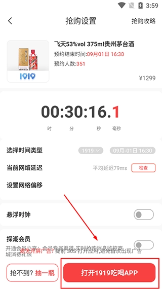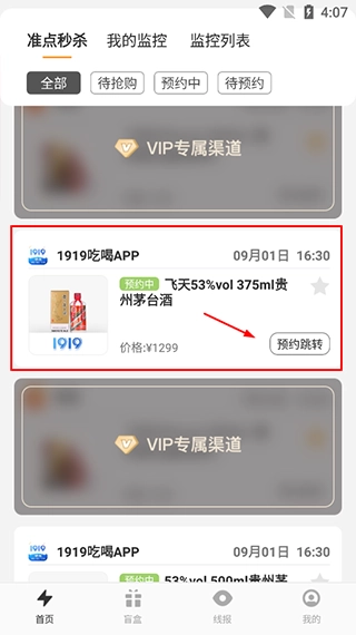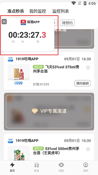 1、登录探潮抢茅酒神器app,点击页面【1919吃喝app】预约抢购