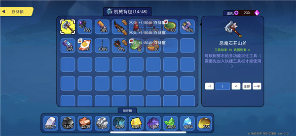 6、刚开始先制作两个储存箱,随后更换为青铜箱(其性价比是最高的),到了后期则直接升级为机械箱。装备方面同样如此,从青铜直接过渡到机械(因为铁资源稀缺,金的生产速度又比较慢)。