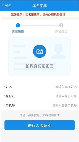 3、填写好姓名、身份证号码以及手机号,接着拍摄身份证正面,随后点击进行人脸识别以完成实名采集。完成实名后,便能够开展办税绑定操作了。