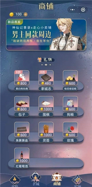 觉得羁绊值增加得太少?点击“商铺”,用做任务获取的【金币】购买礼物,送给你心仪的男主就行。不同礼物增加的羁绊值不一样,记得把礼物送给珍视它的人哟。每天都会刷新特价礼物,要是你懂得把握时机,就能在特价时大量购入礼物,让金币发挥最大价值~