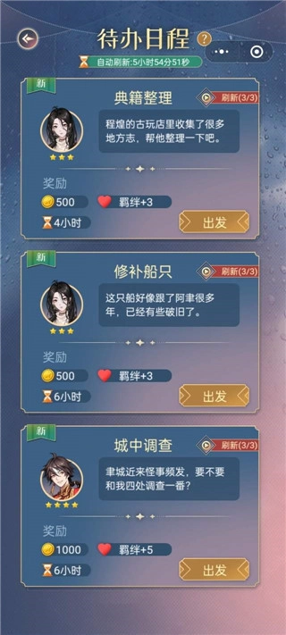觉得拜访和直接提升速度过于缓慢?别担心,我们另有妙招:回到“聿城”界面,点击“日程”,开启与男主们的共同出行之旅~点击“出发”后,便可从四位男主中挑选一位与你同行。记得留意任务提示,挑选最合适的男主,这样才能获取最多的羁绊值哟~