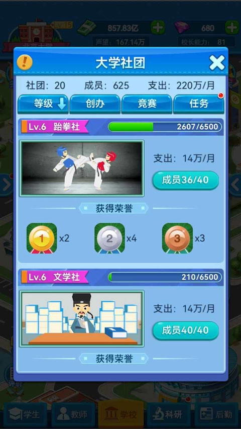 10、社团,不需要花费太多精力在这个上面,任务也不需要搞(国家资助任务可以弄弄),只需要扩建然后造出所有社团让他们自己比赛拿奖升级就行。