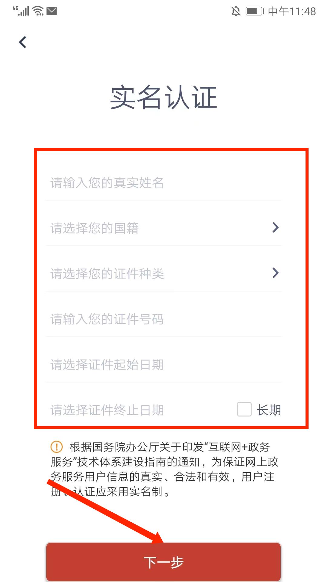 3、进入“实名认证”界面,填好相关信息后,选择“下一步”,就能完成实名认证。