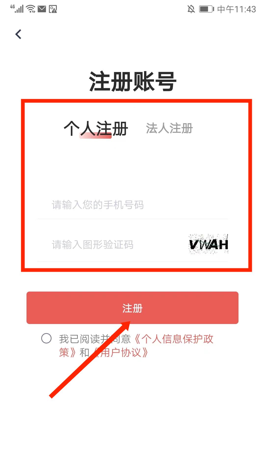 3、来到【注册账号】页面,该页面提供个人注册与法人注册两种类型,用户可依据自身需求,选择对应的类型完成注册。