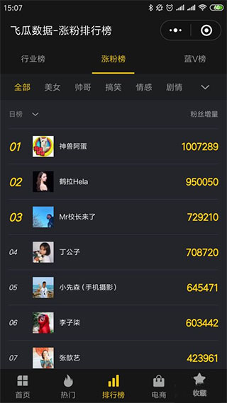 3、不仅能够查看当日涨粉榜单,还能依据周榜、月榜进行查看。此外,飞瓜数据支持分行业查看各行业近期的涨粉黑马数据。