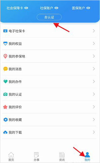 1、登录四川人社最新版本成功后,点击我的,点击我的认证进入。