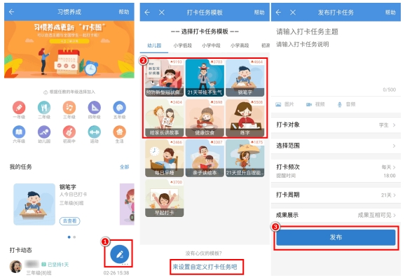 开启app,进入“习惯养成”应用。在应用首页右下角找到“铅笔”图标并点击,随后可挑选合适的打卡任务模板,也能自定义打卡任务。接着设置具体的打卡内容,像打卡对象、打卡频次、打卡周期之类,设置完毕后点击“发布”就可以了。