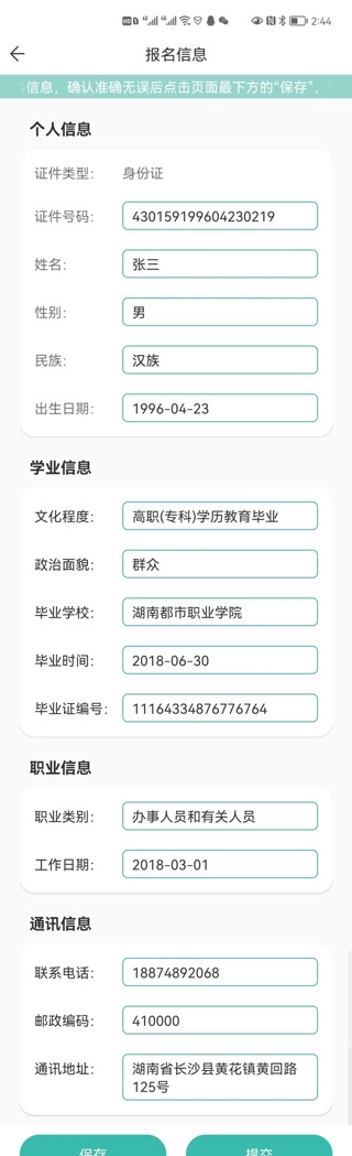 -“填写报名信息”页面,“保存”按钮只保存页面信息,“提交”按钮保存页面信息,同时进入下一个环节;