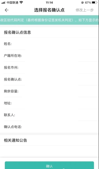在“资料上传”页面,点击“提交”按钮,就能进入“确认信息”页面。完成核对且无误后,点击“确认按钮”,会进入“预约报名确认点”页面。在此页面,需选择报名市州与报名确认点,接着点击“预约”,此时会弹出提示框,询问是否同意 APP 进行人脸核身。若不同意,线上报名流程随即终止,需前往线下现场报名;若同意,则进入人脸核身环节。页面右上角设有“修改上一步”链接,点击可返回上一步进行修改。