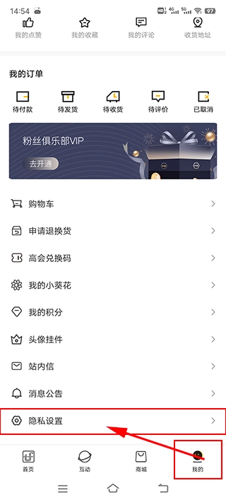 1、进入软件主页中“我的”,点击打开其中的“隐私设置”