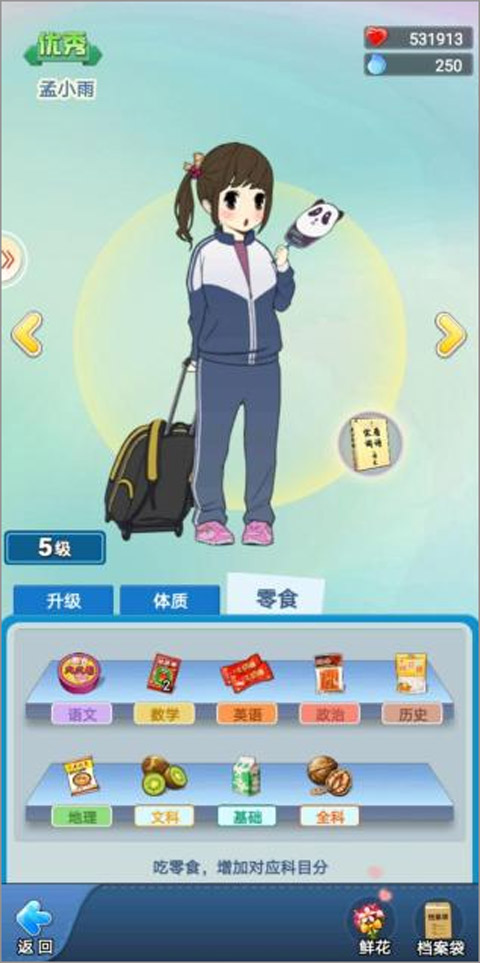上学时的零食总让人念念不忘,而在这里零食又新增了全新功能~食用不同的零食后,对应增加不同科目的分数。零食可通过在小卖铺(主页面点击走廊-小卖铺)购买或走访获得。
