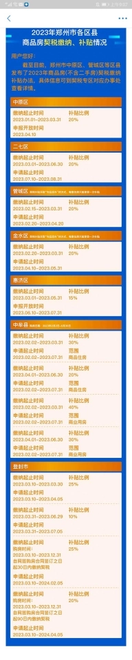 作为一款智慧城市大脑应用,郑好办提供新房契税申报办理服务。不仅如此,市民关注的交契税、提取公积金、申请购房补贴、领取契税补贴、查询房产证信息等各类房产相关政务,都能在此获得咨询与办理。在这里,还能查看中原区、管城区、金水区、惠济区、中牟县、登封市、二七区等各区县契税补贴缴纳起止时间、补贴比例及申请开放时间等详细公告信息,助力市民第一时间掌握关键信息,更便捷地办理新房契税申报、补贴领取及信息查询等事务。