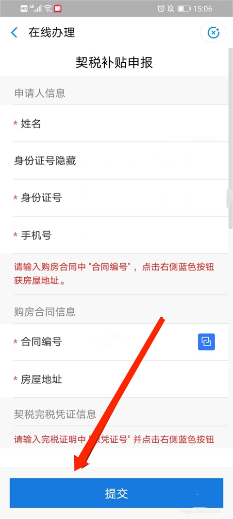 4、进入【在线办理】页面,按顺序填写【姓名】【身份证号】【手机号】【合同编号】以及【房屋地址】等相关信息,随后选择【提交】选项,就能领取契税补贴。以上便是郑好办契税补贴的具体流程。