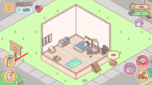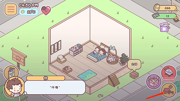 4、进入游戏主界面,依照提示,将盆栽、沙发和柜子拖动至指定位置。完成新手任务后,就可以自行布置这个温馨有爱的小家啦。